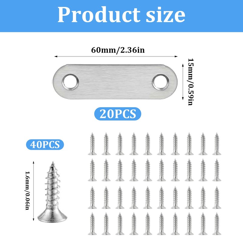 20 Pcs Metal Mending Plates for Wood, Small Flat Brackets for Wood, Stainless Steel Flat Straight Repair Joining Fixing Mending Brace Brackets for Furniture Support Bracket, with Screws(60x15 mm)