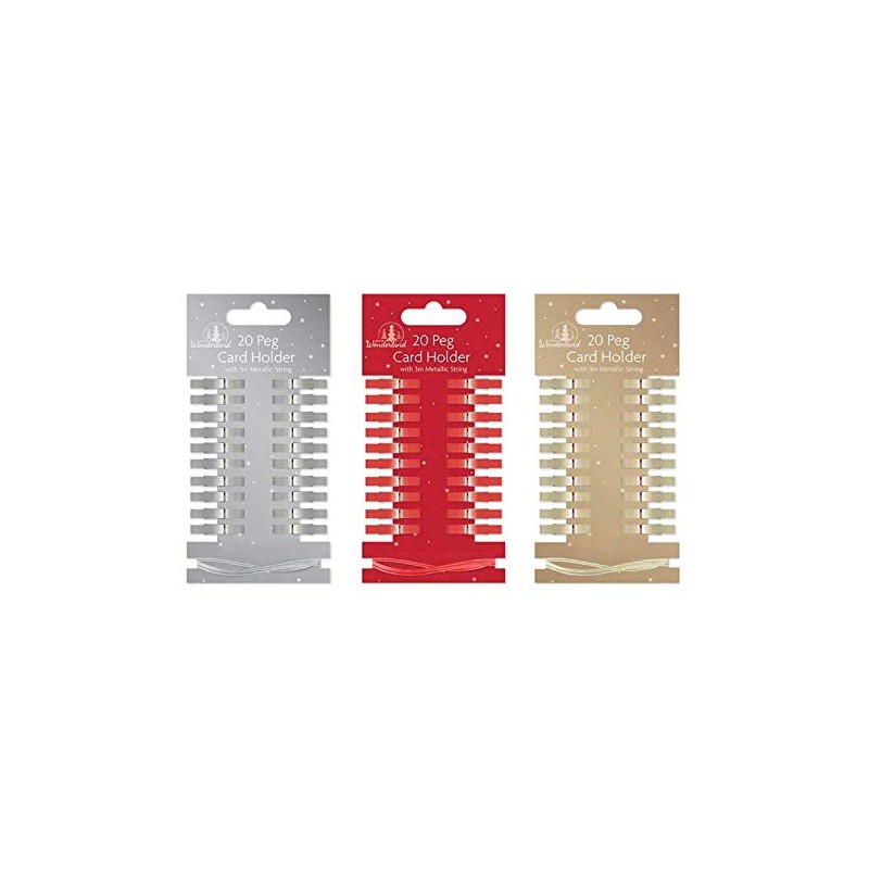 - 20 Pegs Christmas Card Holder & Metallic String- 3 Assorted Colours