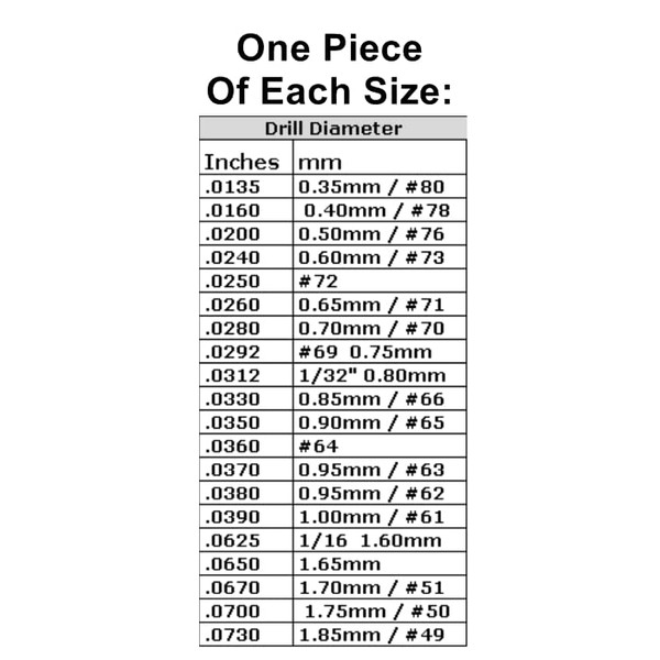 This 20 piece solid carbide drill set is perfect for engine main jets and pilot jets of many carburetors, including motorcycle and R/C engines. Carbide drills are brittle and require precise plunge control, use in a rotary type tool held in a drill press stand attachment or by hand carefully with a pin vise. Do not attempt to use in a hand-held electric drill, they will break.