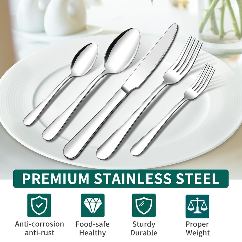 • 🍴 Excellent design --- Excellent design of comfortable and long handle to these flatware sets. Exclusive durability. These flatware sets adopt durable stainless steel material and mirror polishing processing technique.