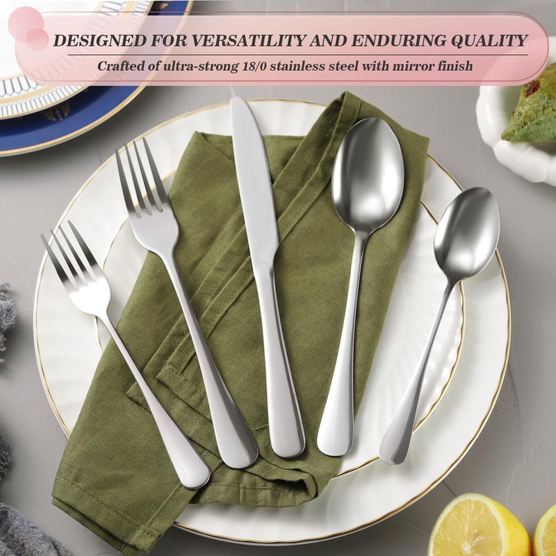 - PREMIUM KITCHEN ESSENTIAL TABLEWARE SET:Designed for versatility and enduring quality, our flatware set is a kitchen drawer essential you'll use for both weekday lunches and festive brunches. Crafted of durable 18/0 stainless steel with a lustrous mirror polish, the understated design retains its good looks through daily use and pairs easily with traditional and contemporary serveware.