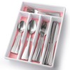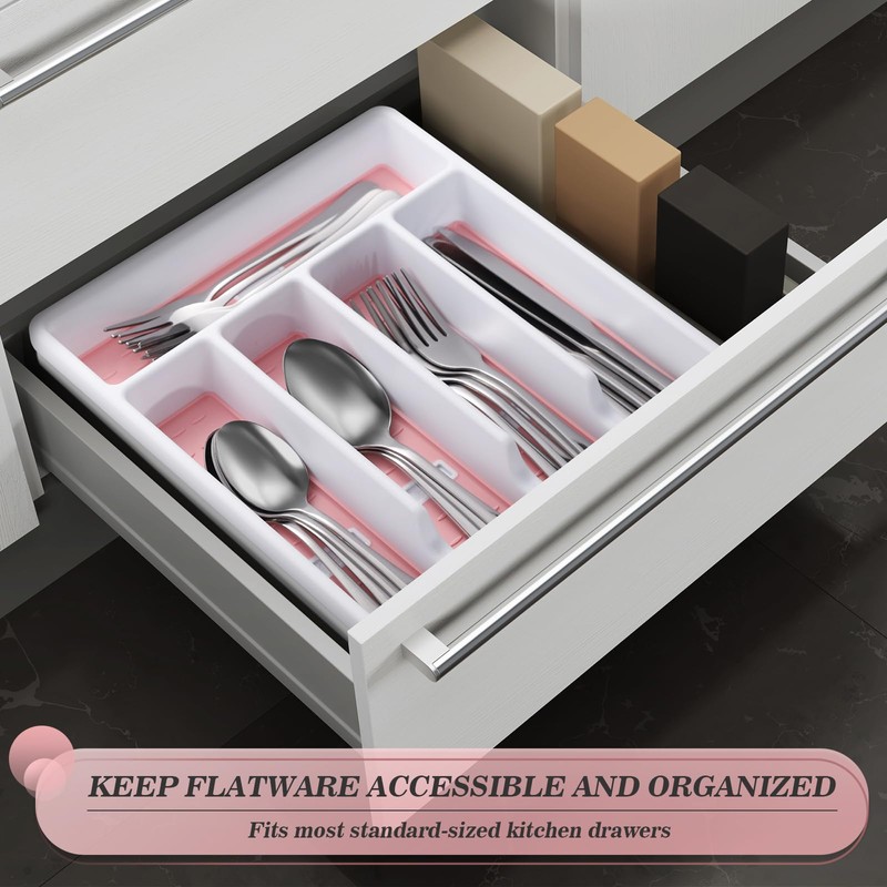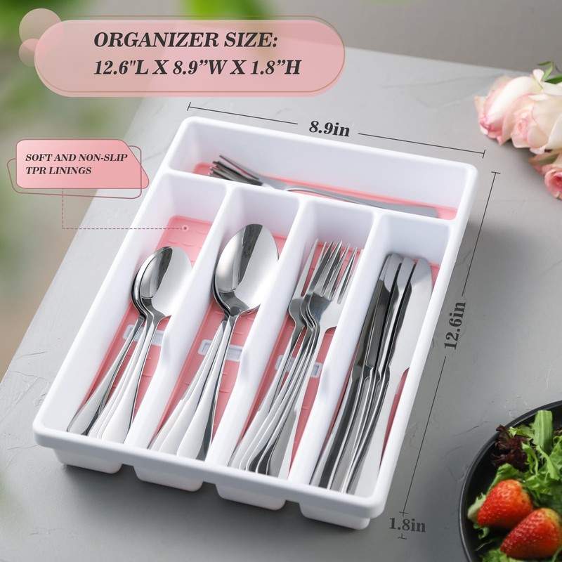 - 5-COMPARTMENT ORGANIZER WITH CUTLERY ICONS:It provides the perfect habitat for knives, forks and spoons and other kitchen necessities, and comes with icons to help you better store and sort,with this you will find that your kitchen drawers will be neat and organized.Measures 12.6"D x 8.9"W x 1.8"H,fits into most standard kitchen drawers.
