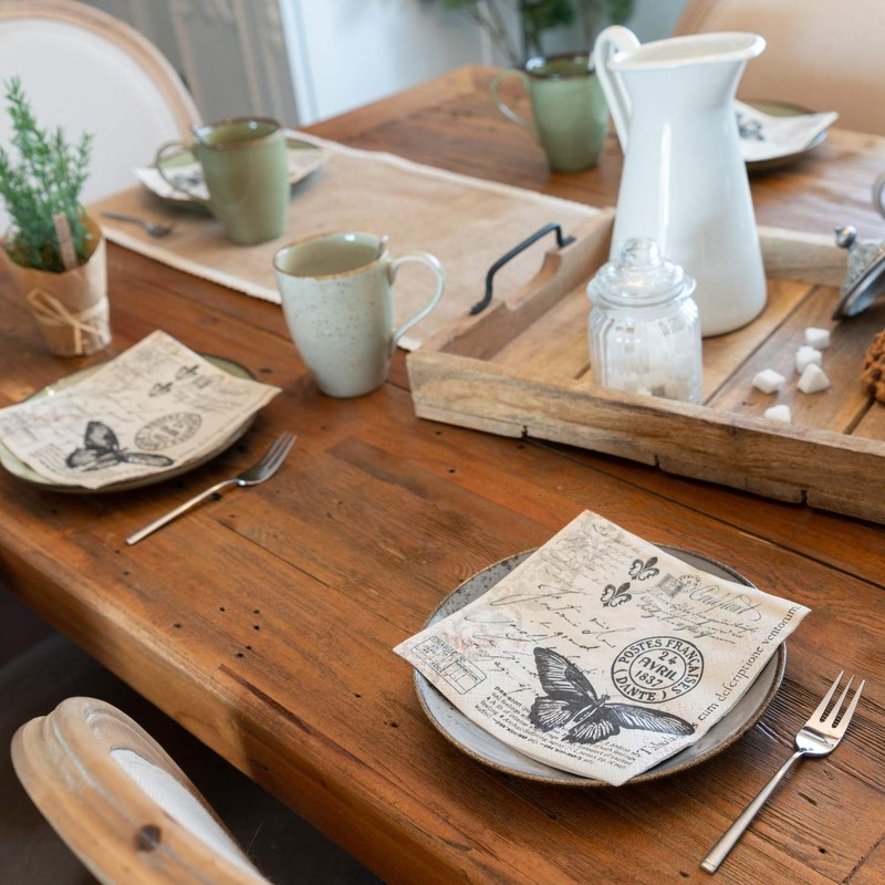 This printed napkin through its seemingly handwritten inscription elegant and stylish grafted to every table. The creamy tones reflect the trends of the season.