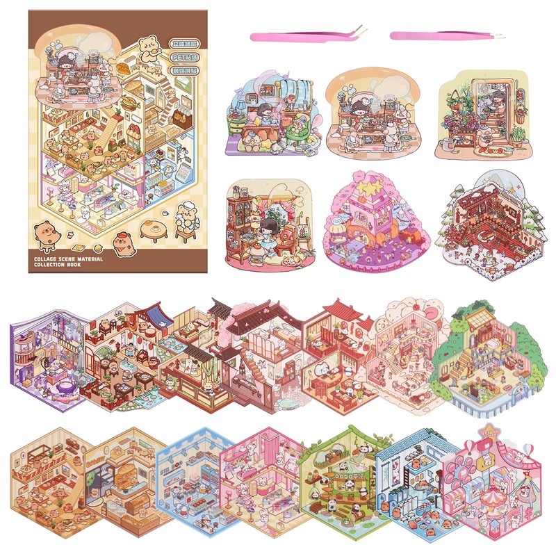 - 3D Miniature Worlds: This set features 20 intricately designed 3D sticker scene—from a charming convenience store to a mouth-watering burger shop. With its delightful cartoon-style stickers, this sticker scene book is perfect for craft lovers and creative minds. Thanks to high-definition printing and precision cutting, every piece boasts vibrant colours and crisp, lifelike details.