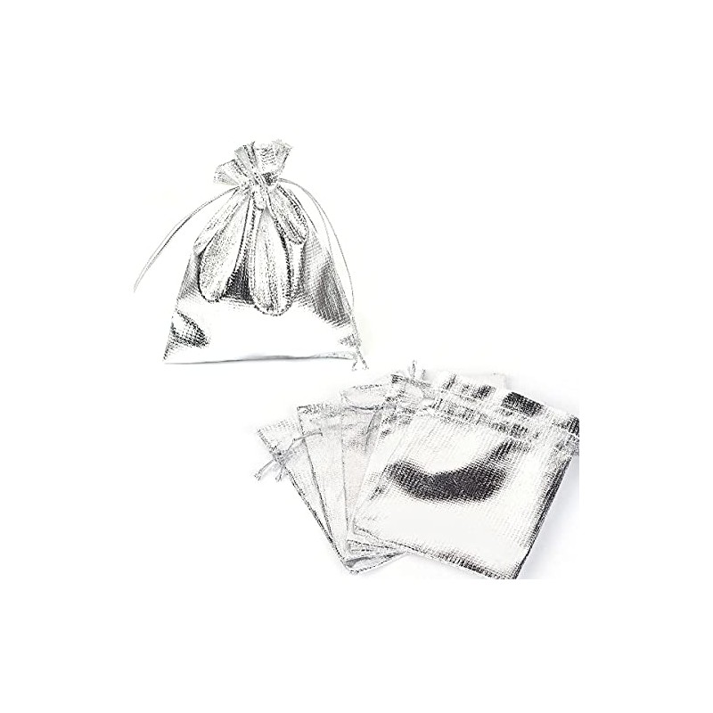 20 Small Solid Opaque Shiny Organza Drawstring Jewelry Gift Pouch Bags with Cinch String (Silver)