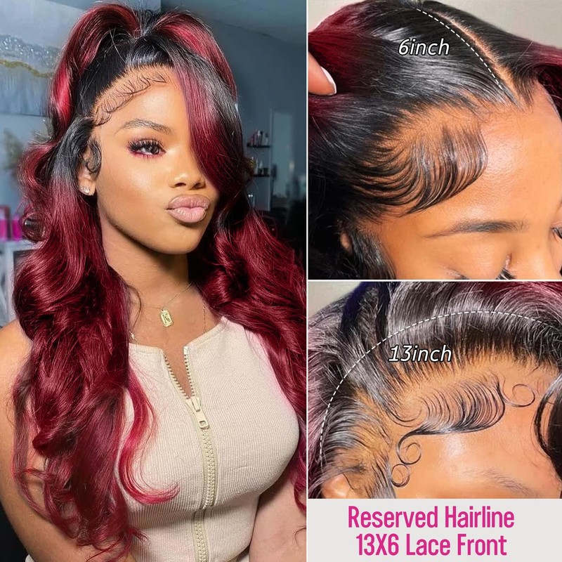 - 💗【Burgundy Lace Front Wigs Human Hair】:13X6 Burgundy Lace Front Wigs Human Hair no weird layers,bleached knots,13X6 18-32 Inch glueless wigs human hair pre plucked with around baby hair make it more natural,no shedding,no tangle, no chemical process.