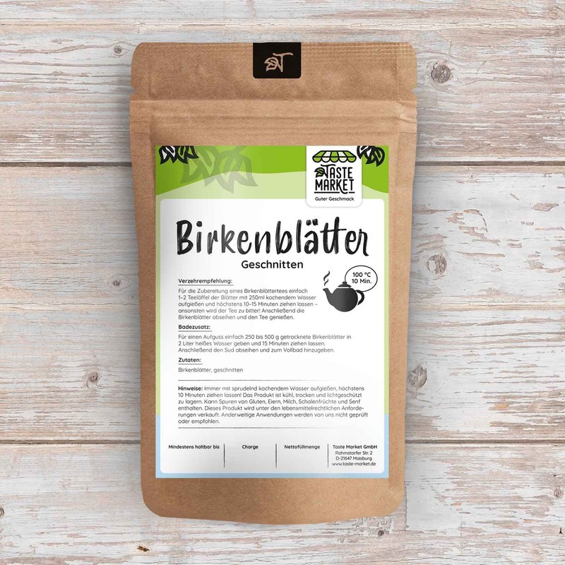 - 200 g birch leaves: 100% pure and free from any additives, after harvesting, they have been gently dried, cut and are ready to be processed by you. To prepare a birch leaf tea, pour approx. 1-2 teaspoons of the leaves with 250 ml of sparkling boiling water and let the whole infuse for 10-15 minutes. Then you can strain the birch leaves and enjoy the tea warm or cold and have a slightly bitter, tart taste.