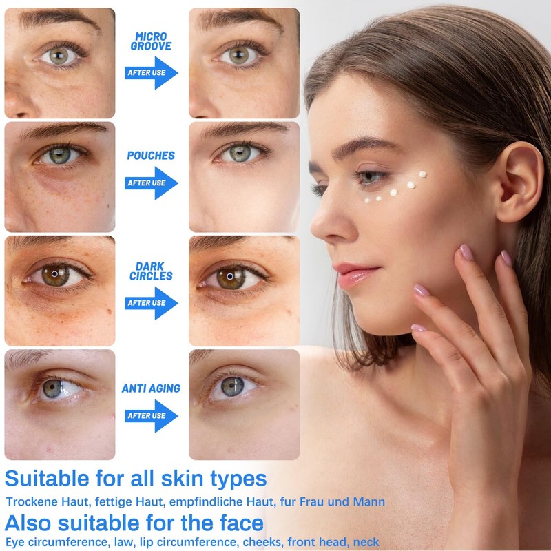 - Quick-absorbing: eye cream against wrinkles, smooth texture, mild and non-irritating, can be absorbed with a wipe, and the flavanol slows irritation and moisturises the skin. Dark circles cream helps reduce skin problems such as sensitive eyes, dark circles, swelling, fine lines, wrinkles around the eyes, crow's feet, ageing eyelids, hanging eyelids or dryness around the eyes, pigmentation and stains.