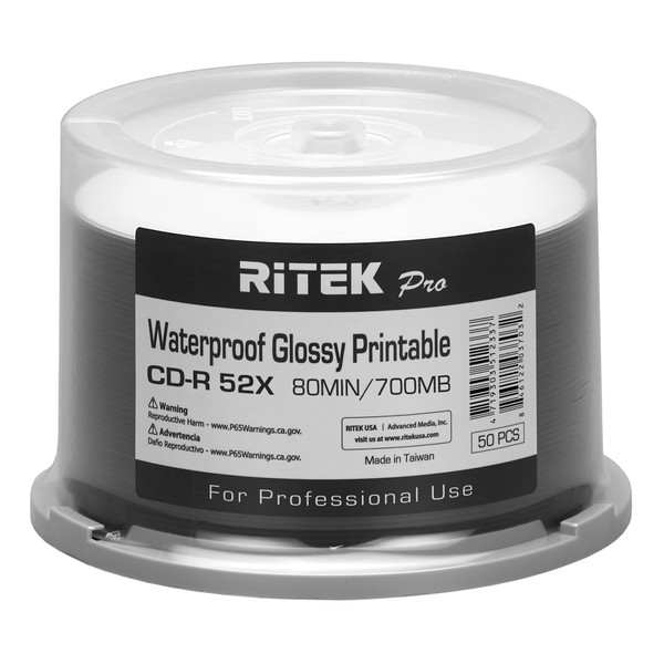 200 Pack Ritek Pro CD-R 52X 700MB 80Min Professional Grade Watershield Water Resistant Glossy White Inkjet Hub Printable Blank Recordable Disc