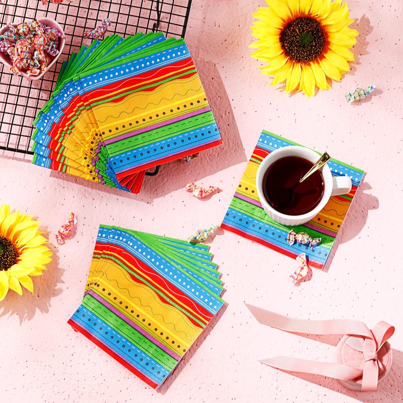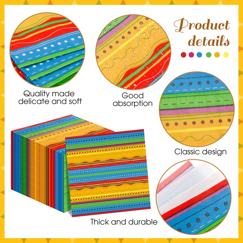 - Suministros para fiestas: estas servilletas de cóctel para fiestas están compuestas por rayas de colores, brillantes y atractivas, se ajustan al tema de los festivales mexicanos, son fáciles de recibir cumplidos de la mayoría de los niños y adultos