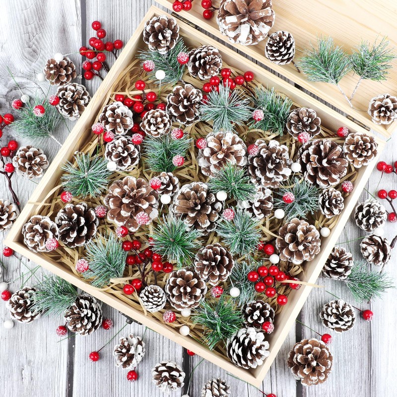 - Festive Decor: This christmas tree pine cones ornaments set includes 60 white rimmed pine cones, 20 white rimmed pine needles, 50 white berries, 60 red snow covered berries, 10 red berry branches for creating beautiful Christmas decorations and ornaments.