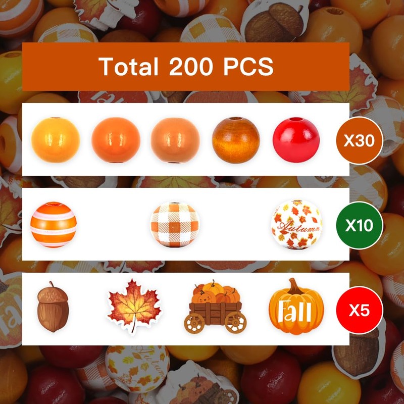 - What You will Get: The package includes 200 pieces fall wood beads, which containing 20 pieces of flat wooden beads in 4 designs, 30 pieces of round floral wooden beads in 3 designs, 150 pieces of solid color wooden beads in 5 colors; They are perfect for fall decorations with rich styles and harmonious matching