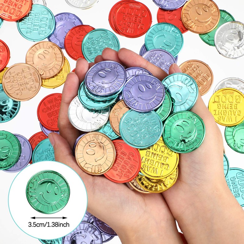 - Rich in quantity and assorted in colors: you will receive 200 pieces plastic reward coins with metallic sheen, one side is engraved with "I was caught being good" letters and the other side has a big smile face, novel and cute, sufficient quantity to meet your various requirements