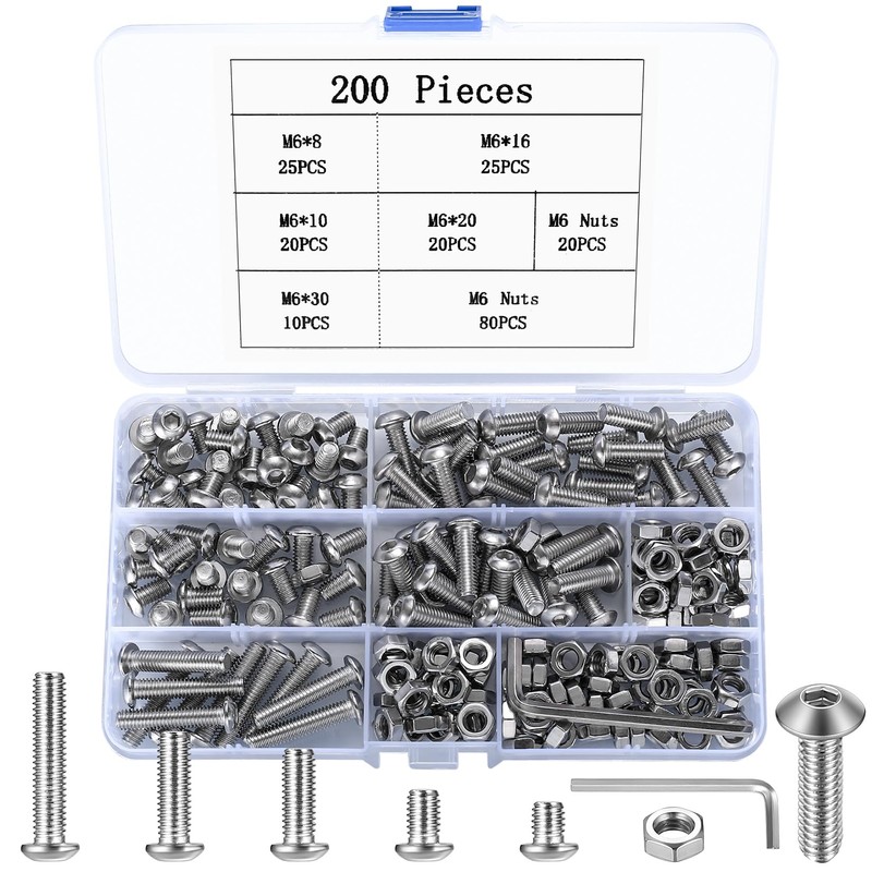 200 pieces M6 screws set, round head hex screws nuts set, hexagon socket screws with nuts set, round head threaded screws set, stainless steel machine screws assortment set