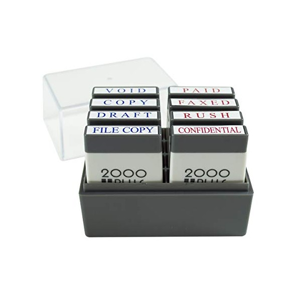 2000 PLUS Pre-Ink Mini Stamp Set with Storage Tray, 8 Messages, Void, Copy, File Copy, Draft, Paid, Rush, Confidential, FAXED, 1" x 1/4" Impression, Red and Blue (030219)