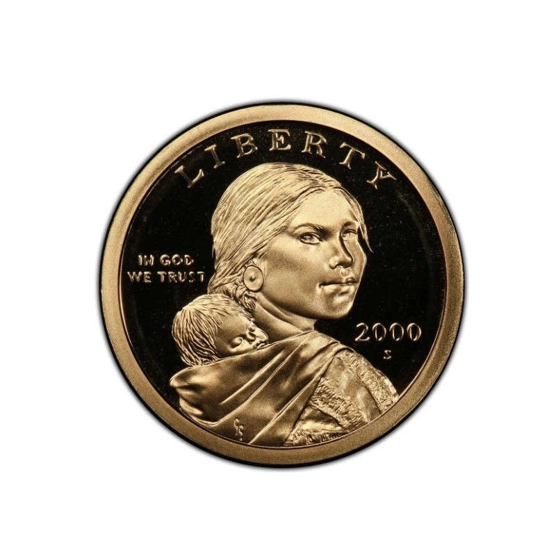 The product is a 2000-S Sacagawea Dollar coin struck in copper brass at the San Francisco mint. This Gem Proof coin features a deep cameo (DCAM) strike, showcasing sharp details and frosted designs against mirrored fields. It is part of the Native American series and does not have a certification number. The coin honors Sacagawea, the Shoshone woman who assisted the Lewis and Clark Expedition.