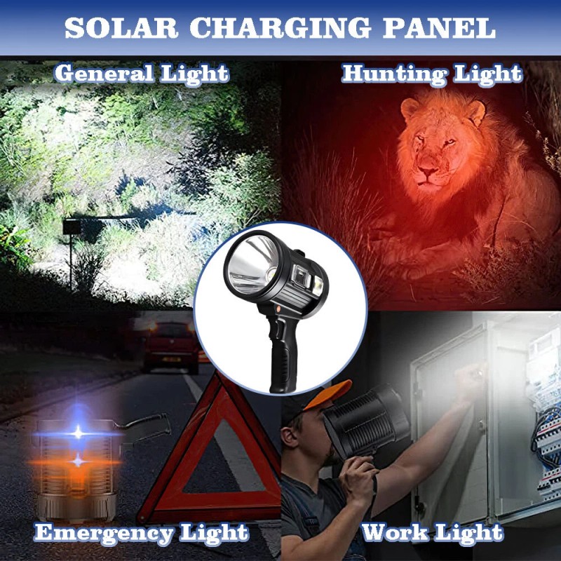 【2 CHARGING MODES】The bright heavy duty flashlight can be charged through a socket or a solar panel. The advantage of USB rechargeable spotlight is faster charging speed and less wear on the charging port, making it more solid. This LED spotlight flashlight features direct USB charging, eliminating the need to disassemble the spotlights. Please note that the solar charging speed depends on the intensity of light and its impact on the surface area