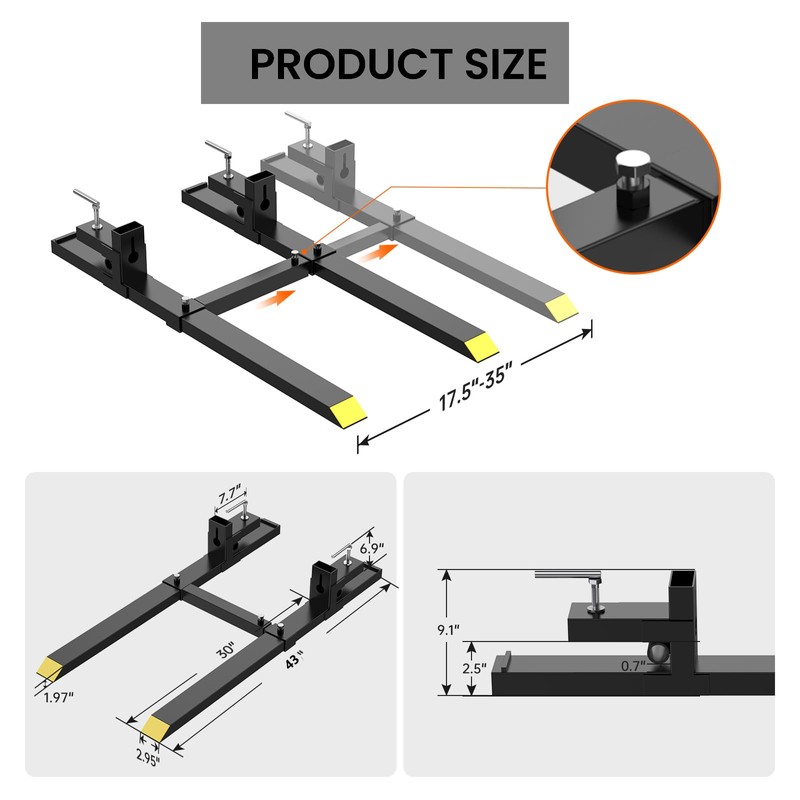 - 【Specification】Load:2000Lbs Max. Overall Length: 43", Fork Length: 30", Fork Width: 3.7", Fork Height: 1.97", Bucket lip gap: 2.48". Adjustable stabilizer bar can be adjusted from 17" to 35" W