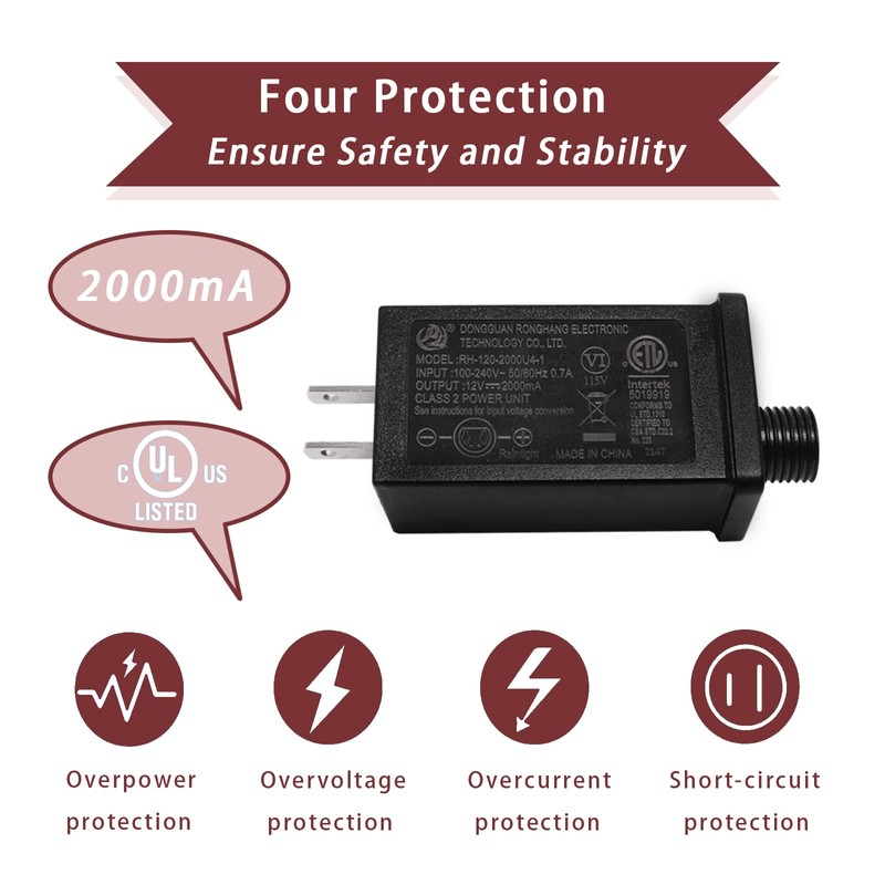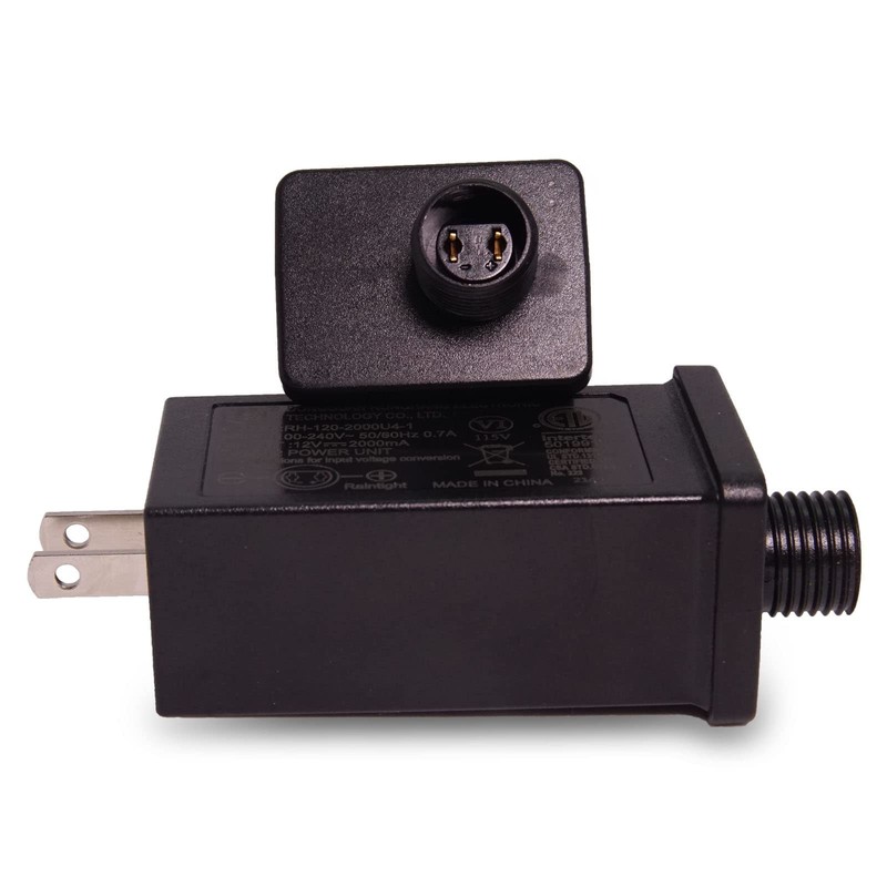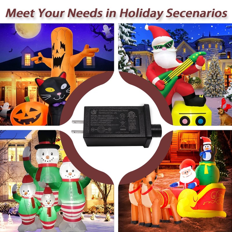 - Specification of Christmas Inflatable Adaptor:Input: 100-240V, 50/60HZ, 0.7A, Output: 12V, 2000mA, Rated Watts 12W. UL certified power adapter, 110V transformer suitable for most 8-12 ft Christmas Outdoor Inflatables.