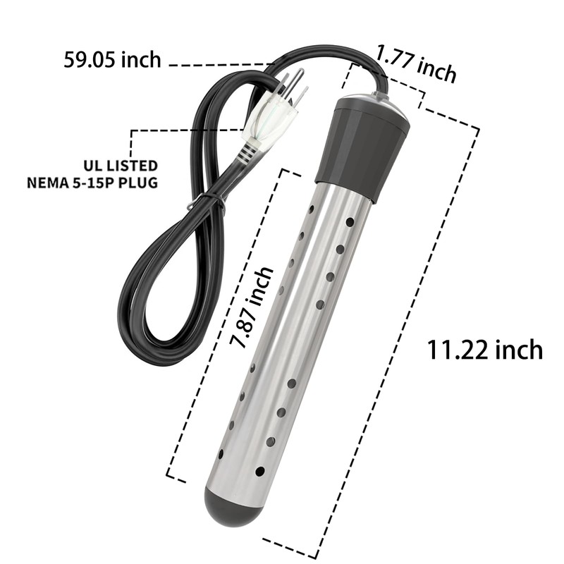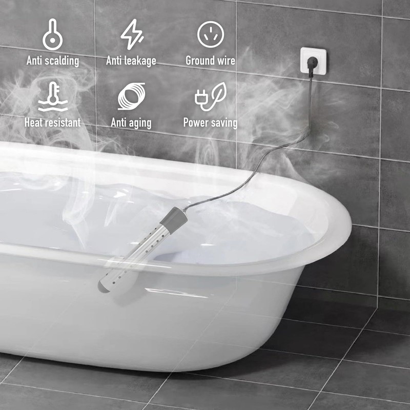 - 4. (Use scenario) First fill the basin/bucket/bath with water and put the heater in, the water level must be at least submerged in the stainless steel heating tube and the temperature sensing probe part, the power cord can also be in the water. The product is safe and portable Suitable for home, school, and outdoor.