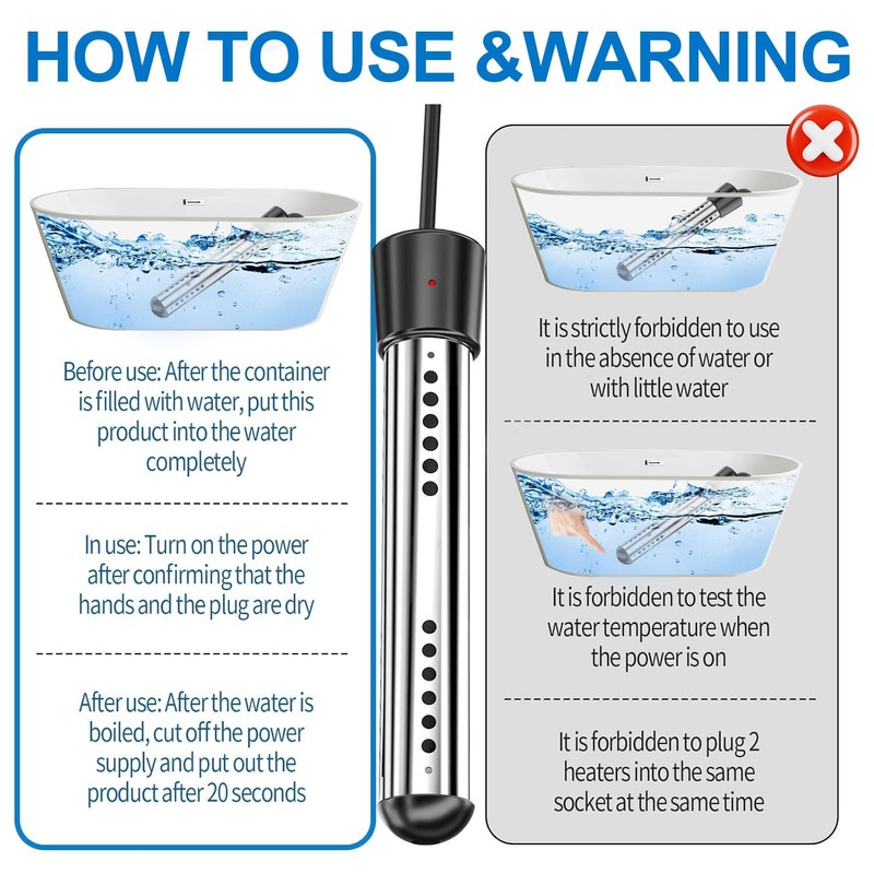 - 【Easy to Use】This portable immersion water heater is compact and ideal for travel, making it the perfect tool for heating water during winter work or when you're on the go. Simply submerge the heater in water and connect it to the power supply.