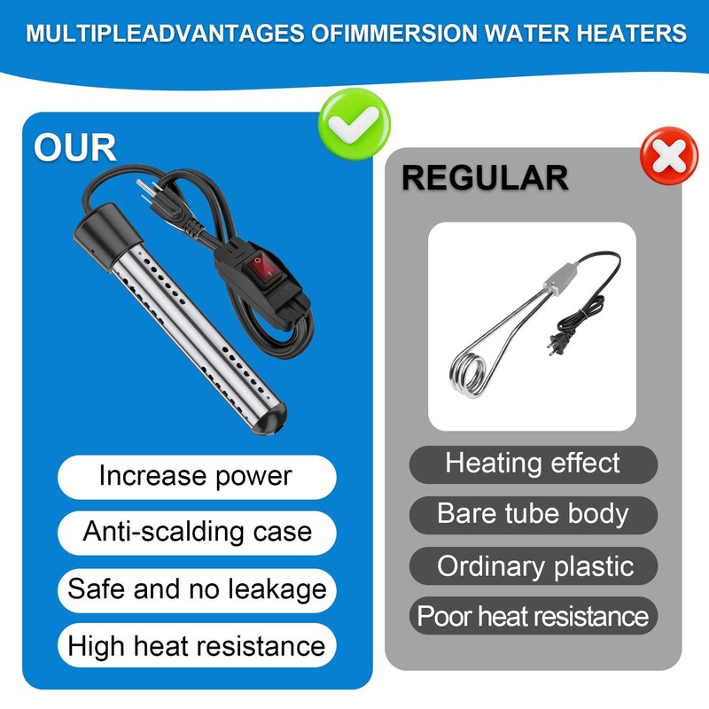 - 【Enhanced Safety Features】The immersion heater features a 304 stainless steel guard to prevent burns and ensure safe operation. Its longer heating tube design reduces surface load, enhancing safety and durability while providing portable hot water anywhere you need it.