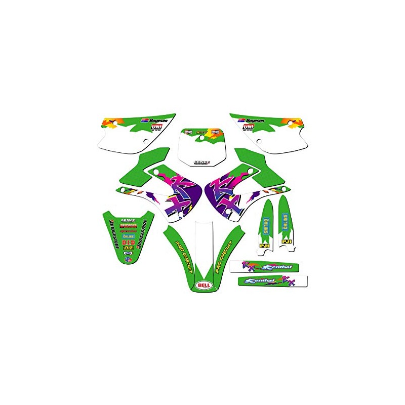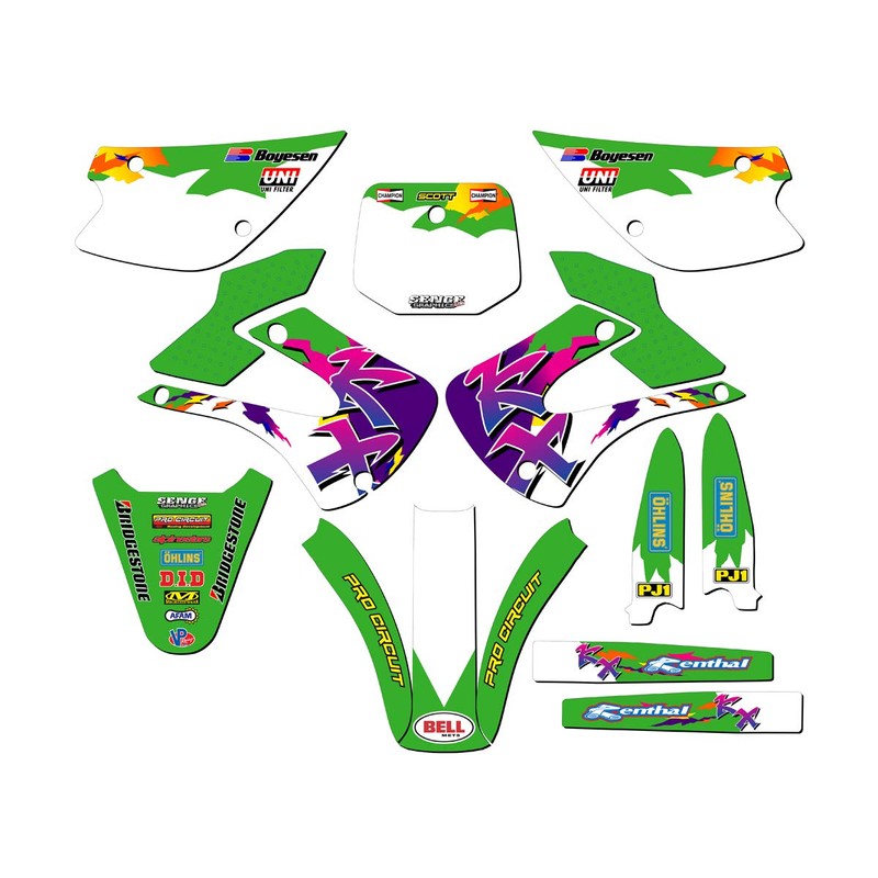 • 2001-2013 KX 100 THROWBACK Green Senge Graphics Kit Compatible with Kawasaki. The photo shown shows the exact decals you will receive. Please refer to the photo to make sure you are getting the exact amount of coverage you want. You can toggle between base, complete, and rider I.D. to see all of the differences.