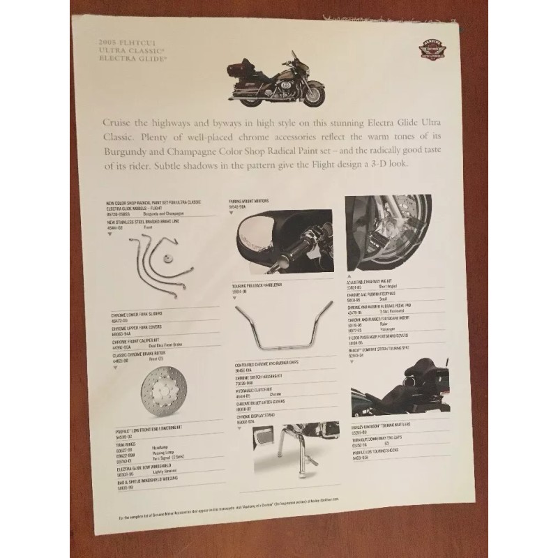 This brochure highlights the 2005 Harley-Davidson FLHTCUI Ultra Classic Electra Glide and the genuine motor accessories available for the model. Grab a piece history! This is a two-sided full color 8 1/2" by 11" glossy page.