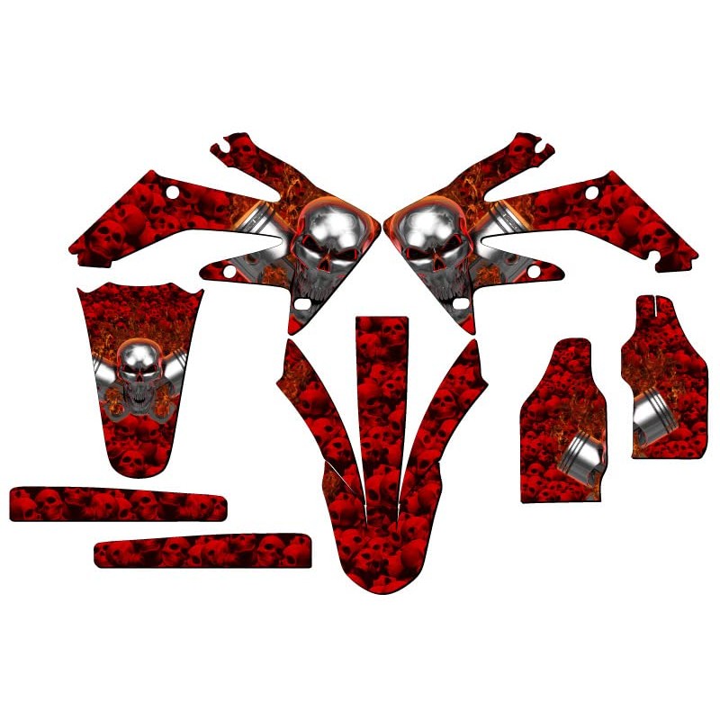- 2006-2007 CRF 250 R FLAMING GEARHEAD Red Senge Graphics Kit Compatible with Honda. The photo shown shows the exact decals you will receive. Please refer to the photo to make sure you are getting the exact amount of coverage you want. You can toggle between base, complete, and rider I.D. to see all of the differences.