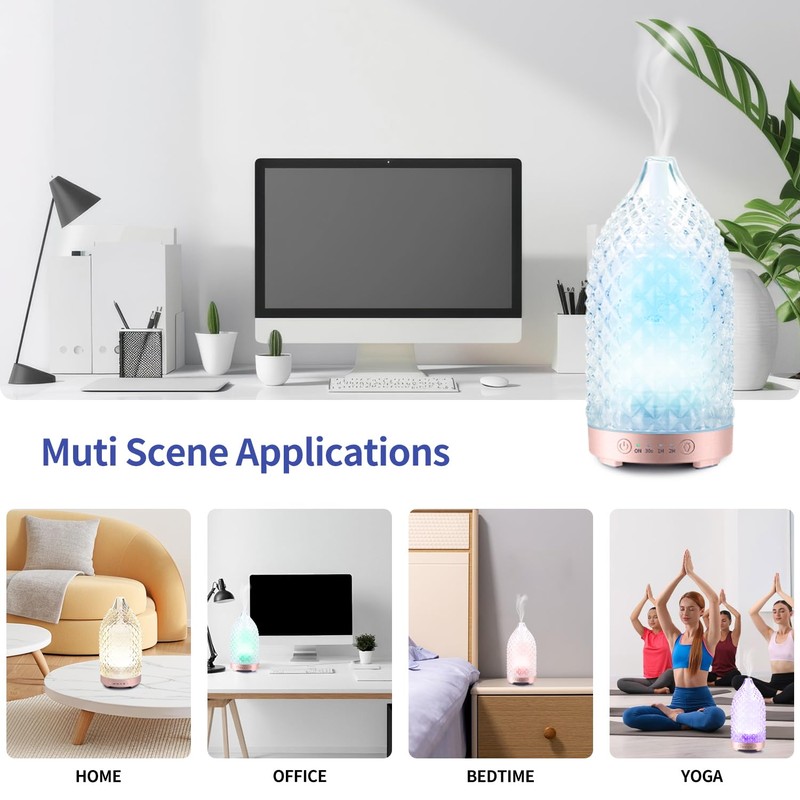 - Glass Cover Design--This 200ml glass diffuser features a hand blown diamond-shaped pineapple pattern glass cover, rose gold plated plastic bases and PP water tank. It not only adds elegance but also provides a clear view for monitoring water levels and ensures easy cleaning. Glass aromatherapy diffuser combines aroma diffuser, mood light, and decoration in one, ideal for use in home, office, bedroom, bathroom, living room, study, spa, yoga room, studio, etc.