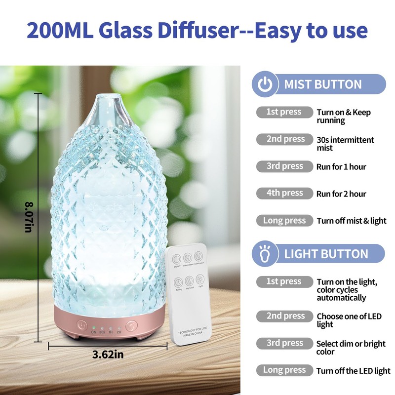 - LOW NOISE--The mist and light functions of this glass oil diffuser work separately. You can turn off the light at night while resting or use this glass diffusers for essential oils as a nightlight. Add 3-5 drops of your favorite essential oils to ensure a pleasing atmosphere for you to relax. The super quiet glass diffuser (<30dB)won't disrupt your peaceful night.