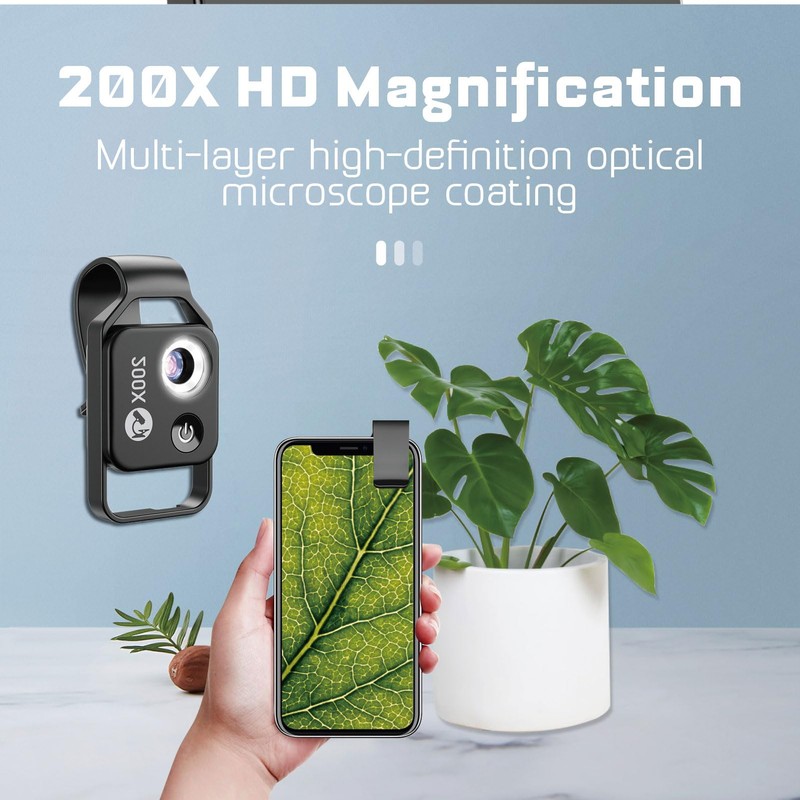 - [200X Magnification Microscope]:This portable microscope turns your cell phone into a professional microscope. The microscope needs to work with your phone's magnification function to achieve 200x magnification. The HD optical lens allows you to take amazing magnified high resolution photos and videos by simply connecting our microscope to your smartphone's native camera.