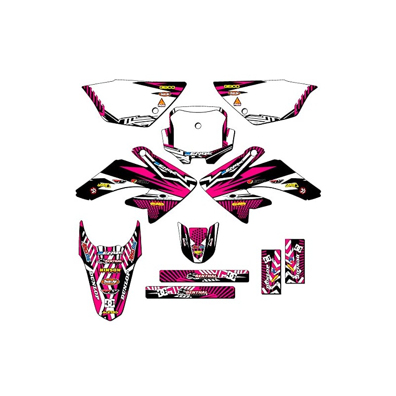 - 2011-2016 CRF 80 MAYHEM Pink Senge Graphics Kit Compatible with Honda. The photo shown shows the exact decals you will receive. Please refer to the photo to make sure you are getting the exact amount of coverage you want. You can toggle between base, complete, and rider I.D. to see all of the differences.
