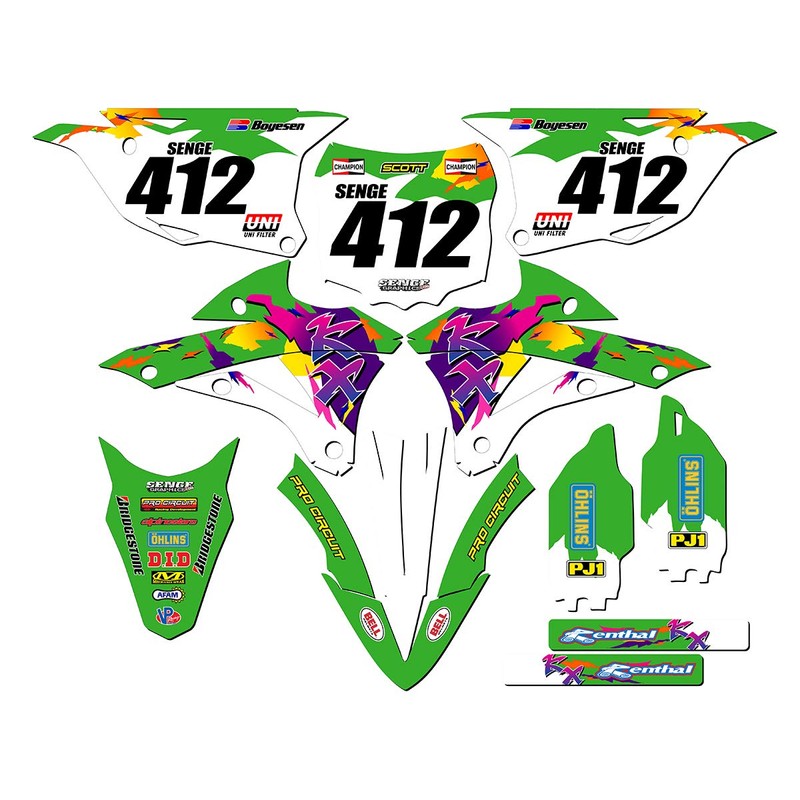 - 2014-2021 KX 100 THROWBACK Green Senge Graphics Kit Compatible with Kawasaki. The photo shown shows the exact decals you will receive. Please refer to the photo to make sure you are getting the exact amount of coverage you want. You can toggle between base, complete, and rider I.D. to see all of the differences.