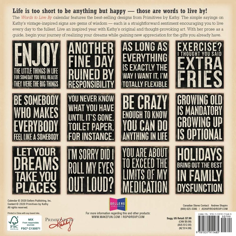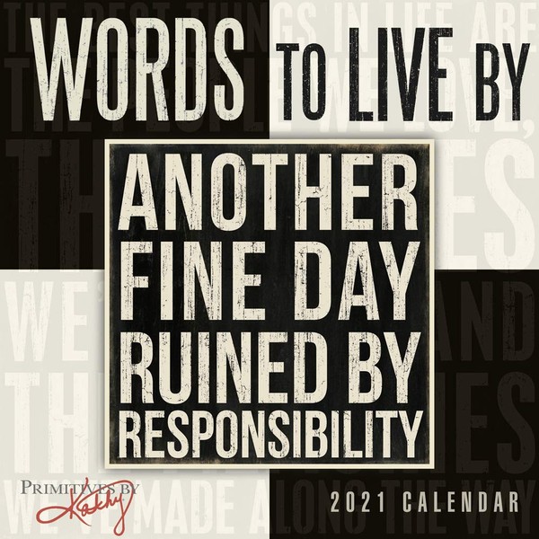 Life is too short to be anything but happy — those are words to live by! The Words to Live By calendar features the designs from Primitives by Kathy. The simple sayings are gems of wisdom, each a straightforward sentiment encouraging you to live every day to the fullest. Live an inspired year with original and thought-provoking art.