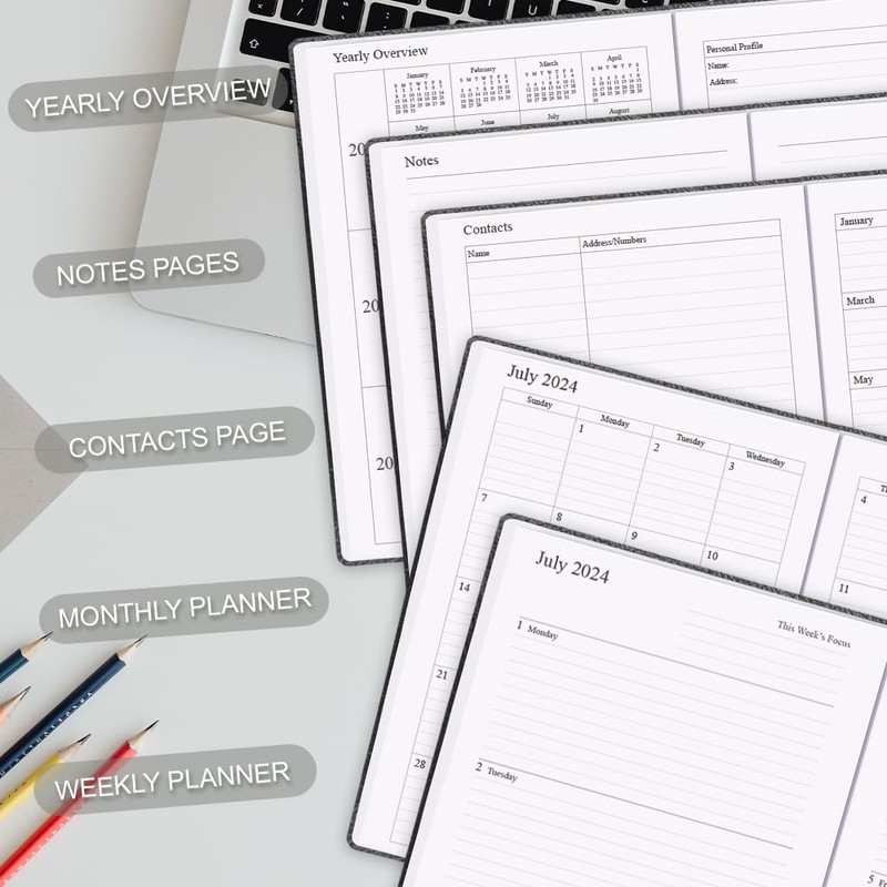 - SUPERIOR QUALITY - Planner 2024-2025 with sturdy PU leather cover to protect the inner pages well. Thick paper to reduce ink leakage, erase fraying and shade issues. Plan, create and schedule your daily life with this gorgeous monthly &weely planner