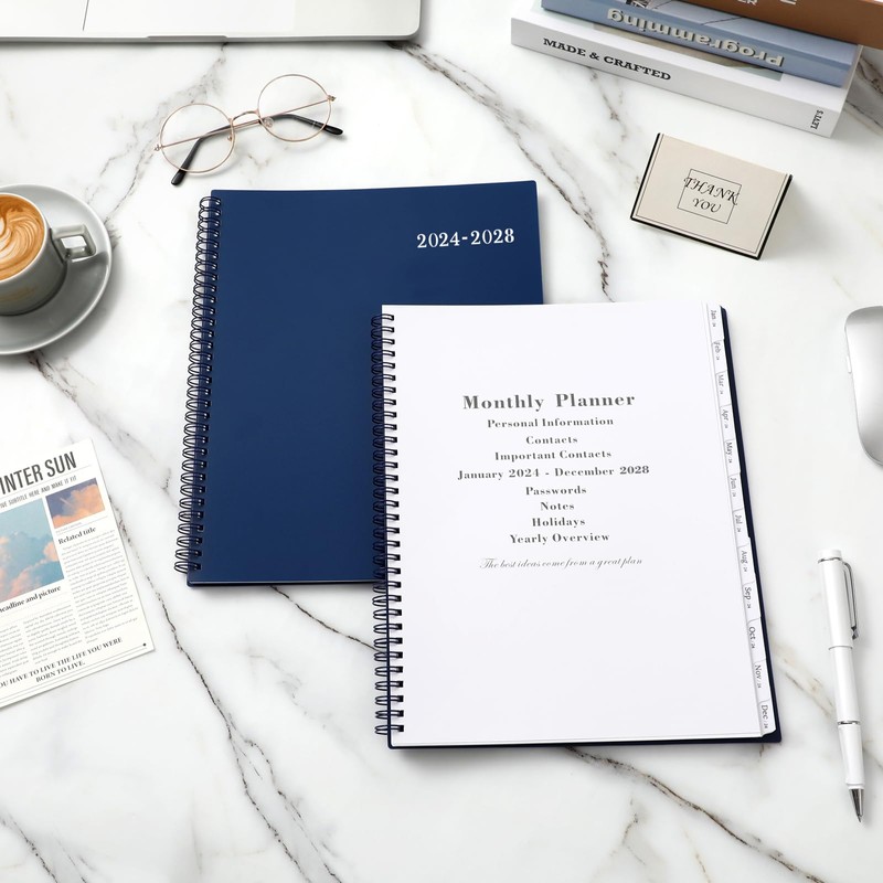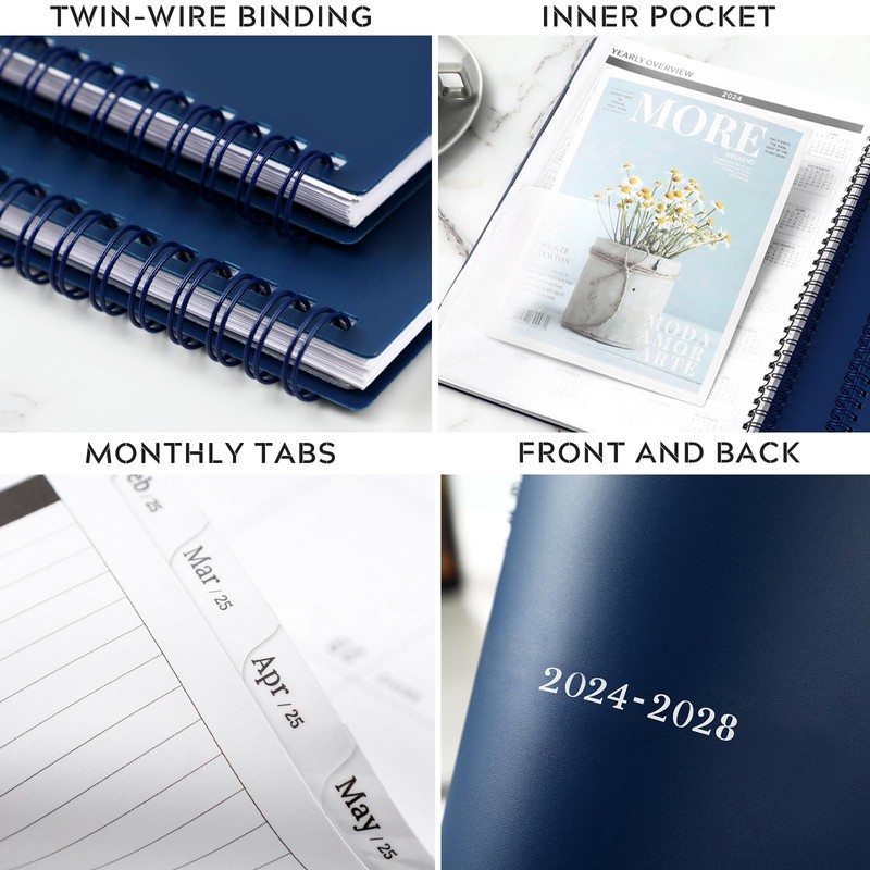 - đź“… PROFESSIONAL DESIGN - Sturdy metal twin-wire binding allows for 360 degree folding over. Flexible durable cover to protect inner pages of this 2024-2028 monthly planner. Coated monthly tabs and back double-sided pocket for storing your scattered items, such as cards.