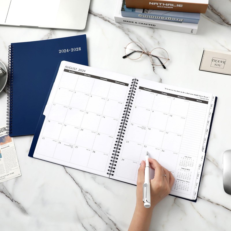 - đź“… MAKE YOUR LIFE PRODUCTIVE - Thicker and pure white acid-free paper, the 2024-2028 monthly calendar is resistant to ink leakage, erasing fraying and shading issues. The classic cover design of this 2024-2028 monthly planner makes it more fashionable and attractive. This all-in-one monthly planner 2024-2028 is a great choice to motivate yourself to achieve your goals.