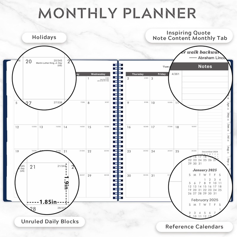 - đź“… MONTHLY OVERVIEW - Each month of this monthly planner 2024-2028 covers two full pages which is great for long-term planning. Unruled daily blocks (1.9" x 1.85" ) for open scheduling and notes columns for your spontaneous and important items. Our monthly planner 2024-2028 contains 3-month reference calendar in each month-page, 60-month reference calendar, coated labels and famous quotes in the monthly planning pages.