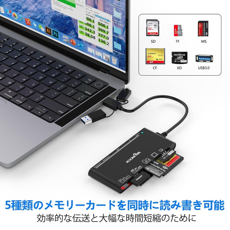 - 7-in-1 Card Reader: Equipped with 2 SD ports (SD /SDHC/SDXC/MMC/RS-MMC) + 2 TF ports (Micro SD/Micro SDHC/Micro SDXC) + 1 CF port + 1 XD port + 1 MS port. With this memory card reader, you can access 5 cards at high speed and share photos and videos anytime without worrying about memory capacity in one unit