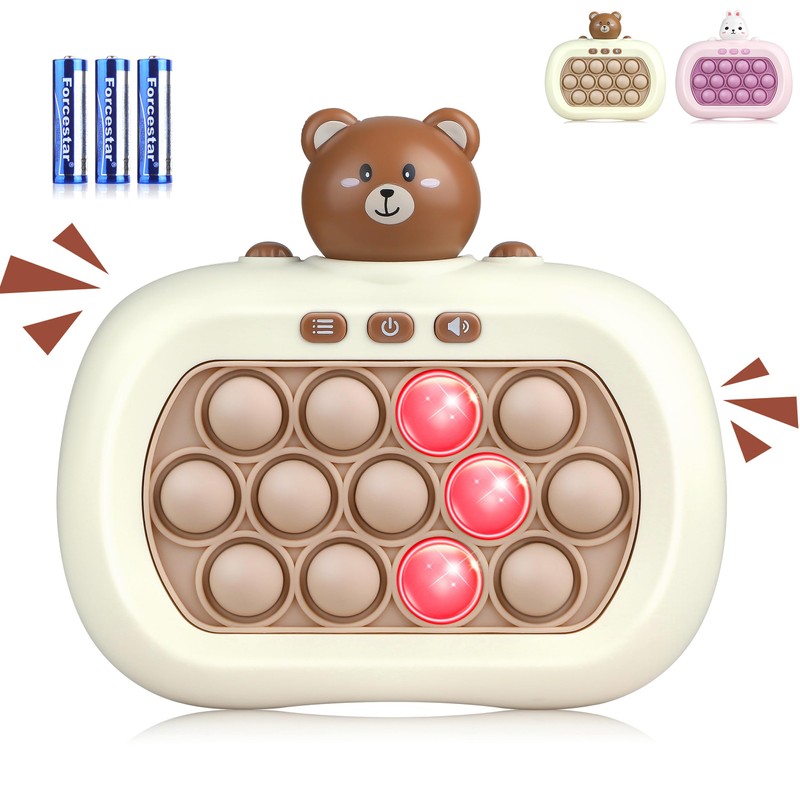 - (Improved Push-Pop Game, 3 x AA Battery Operated (Included) The bubble button is made of high quality silicone material that is hard to break, durable and has a smooth appearance and no burrs, making it safe for children to play. In addition, the shape of the game handle is ergonomically designed to prevent your hands from getting tired even when you hold it for a long time. Portable size makes it convenient for you to enjoy the game anytime, anywhere, such as car, train, airplane, home, party, etc. 4 levels of audio adjustment, mutable
