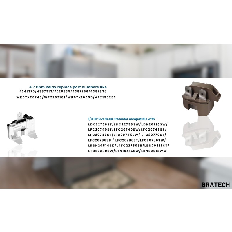 - ✅Broadly Compatible: The 4.7 Ohm 4-pin PTC start relay and 1/4HP refrigerator overload protector are designed for use with multiple brands, including Replacement for Whirlpool, Frigidaire, GE, KitchenAid, LG, and Magic Chef, among others. These parts are extensively applicable and play a crucial role in everyday appliance use.