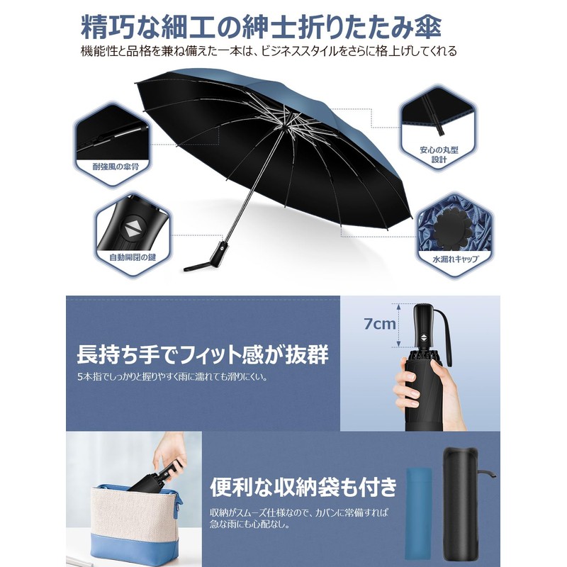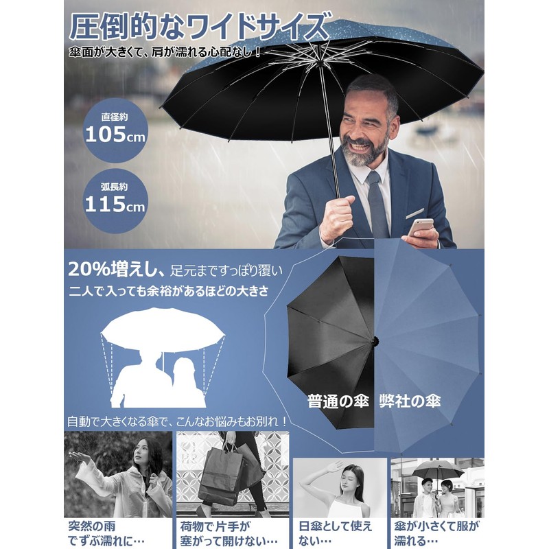 - 強風でも壊れにくい【12本超強靭な骨組みで強化型傘】☂✅ 様々な意見をまとめて、弊社新作の晴雨兼用傘ががようやく登場!柔軟性と強度を併せ持つ12本親骨を採用し、普通の8傘本骨より、耐風性と耐久性ともに向上させた、防食加工が施された傘のフレームは超強靭で錆びにくい上に、強風にあおられても豪雨に打たれても折れたり曲がったりしにくいです。3段折り構造により、強風で裏返ってもちゃんと元に戻ります。安易に折れたり曲がったりする心配ありません。梅雨はもちろん、豪雨、強風にも安心できます。男性の方が求める機能を全て取り入れた究極のメンズ傘です。(※通常の傘より少し重いですが、機能を重んじて傘の強度と大きさを求めて作られています。重さに気になる方は何卒ご理解のほどよろしくお願い致します。)