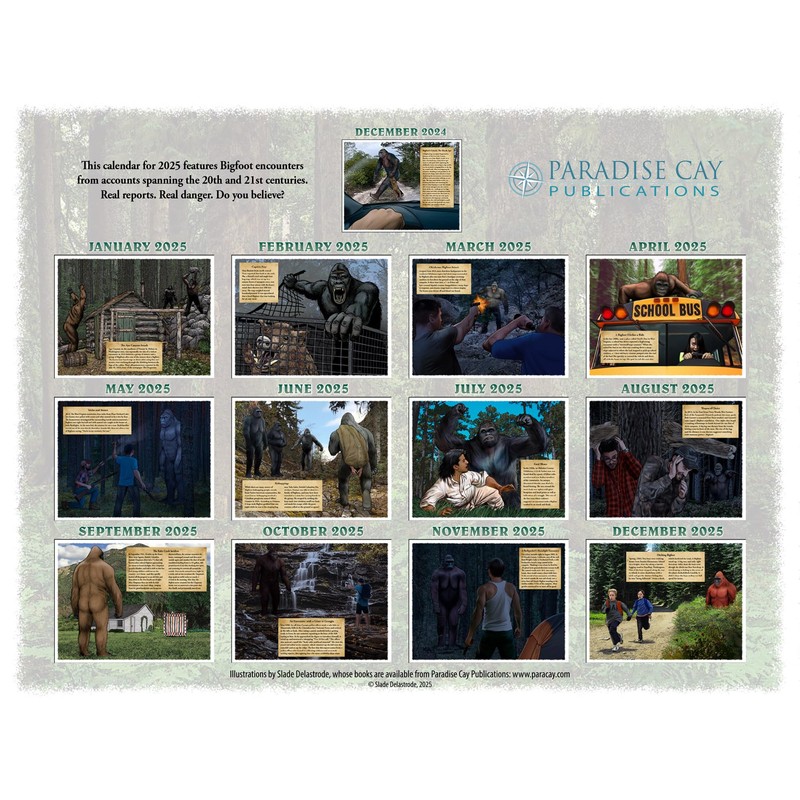 - 13 month calendar featuring Bigfoot and other cryptids: Stay organized and informed all year long with this 2025 wall calendar. Each month unveils a mesmerizing illustration capturing the essence of legendary sightings and haunting encounters.