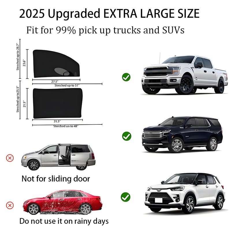 - UPGRADED UV,BUGS AND MOSQUITO PROTECTION: Our Ford Explorer car window screen shade is made from durable nylon mesh that is breathable, stretchable, and provides complete privacy blackout. Designed to keep your children from UV, Bugs and Mosquito, it's also a great car window screen for camping.