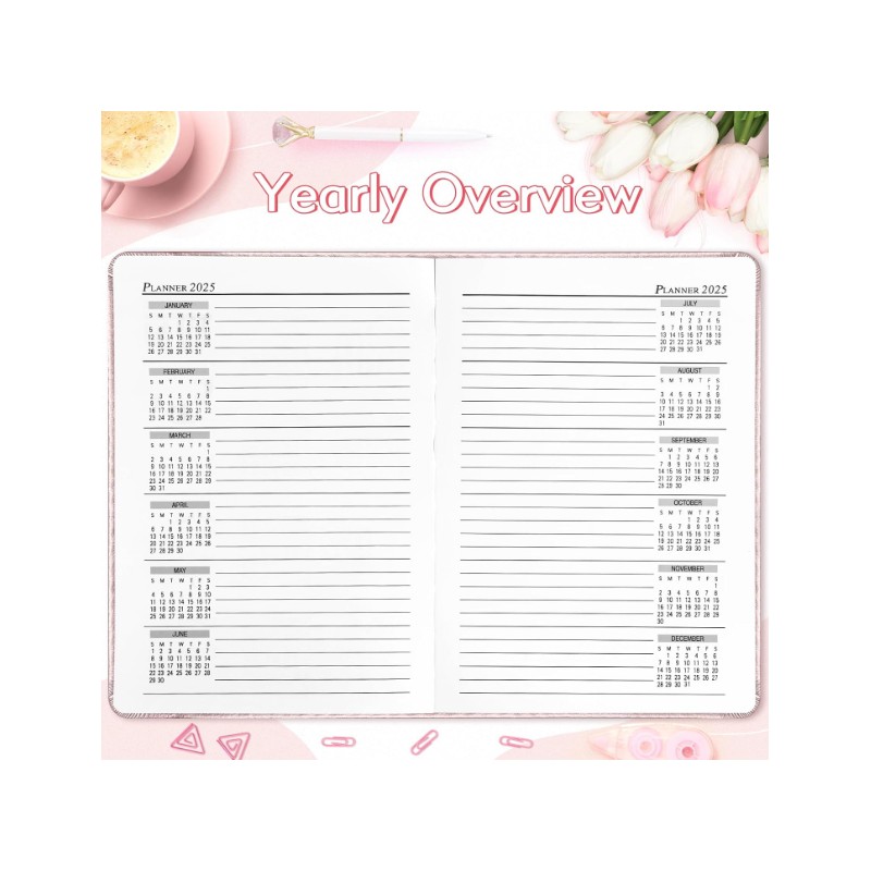🔍 Quick Overview: Includes yearly and monthly overview pages for long-term planning and goal setting.