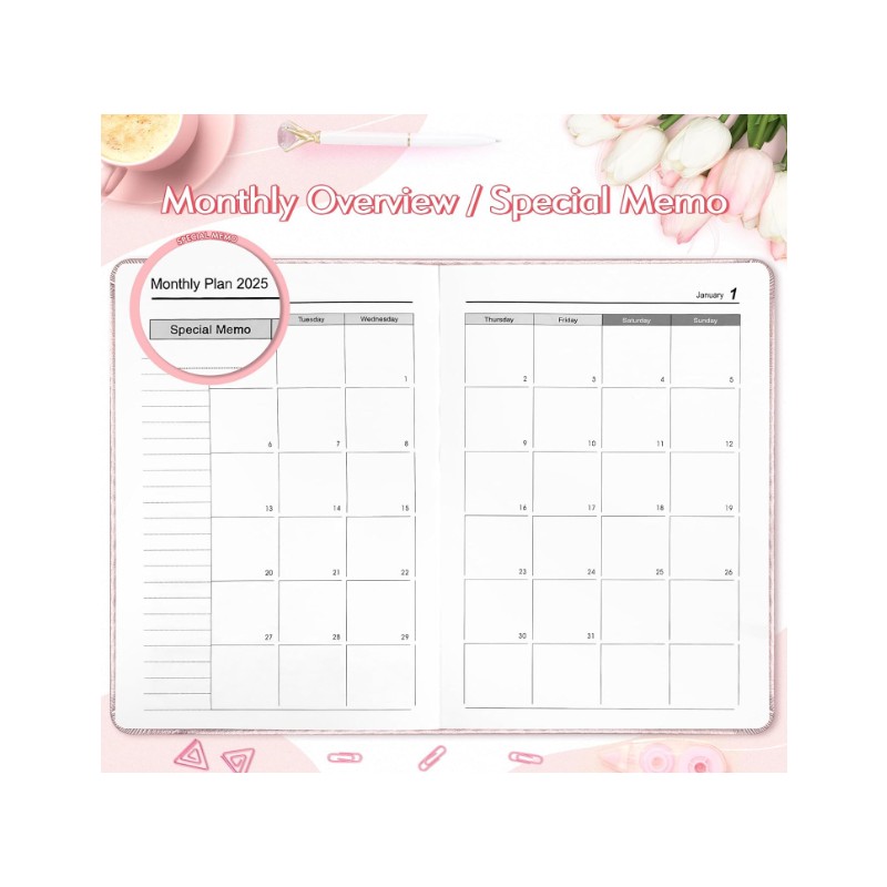 📅 Daily Planning Layout: Features 1 Day = 1 Page format for January to December 2025, with 2 days per page for Saturdays and Sundays. Perfect for organizing your busy schedule.