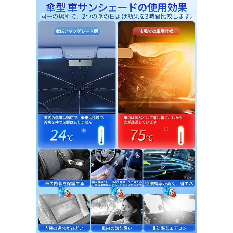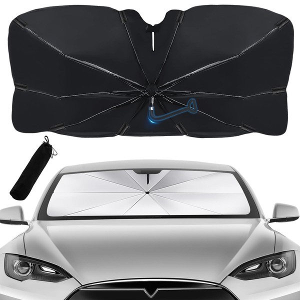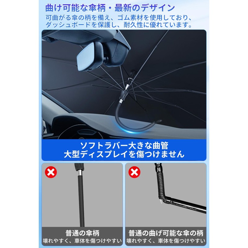 - [Bendable Umbrella Pattern, Protects Dashboard / Latest Design] We've improved the traditional bendable umbrella design using rubber umbrella handle. The traditional metal umbrella handle can break less than 100 times, and the metal material can also damage the car body. This improvement gives your dashboard a better protection and makes the car sun shade more durable. High/low dashboard allows you to fold the umbrella handle for adjustment. Protects your dash from friction to prevent metal umbrella from touching the dashboard. In addition, we specifically designed the pneumatic umbrella cap to prevent scratches on the glass film. All around protection for your vehicle's interior with great care