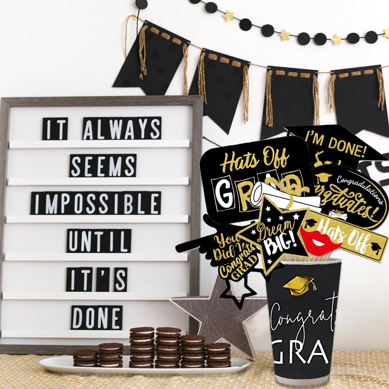 - GRADUATION PHOTO BOOTH PROPS: Want to welcome your graduation in a special way? This graduation photo booth props kit is just what you need. Add these glittery black and gold graduation photo props to your list of decorations and celebrate with your family or friends on graduation party.