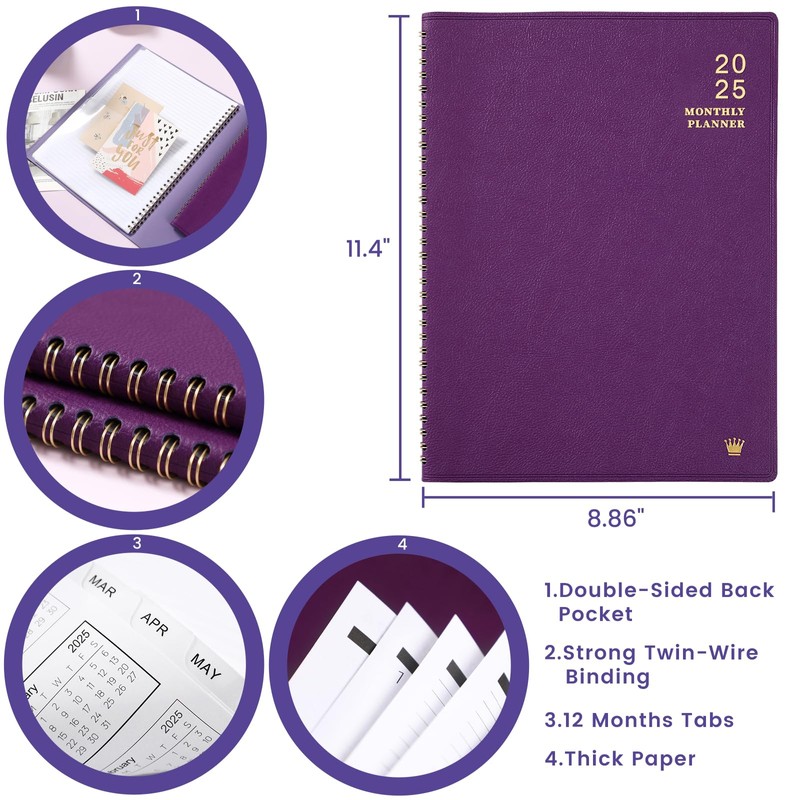 2025 Monthly Planner - Jan. 2025 - Dec. 2025, 12 Months Calendar/Planner 2025 with Faux Leather, 8.86" x 11.4", 15 Notes Pages, Strong Twin - Wire Binding, Pocket, Monthly Tabs, Perfect Organizer